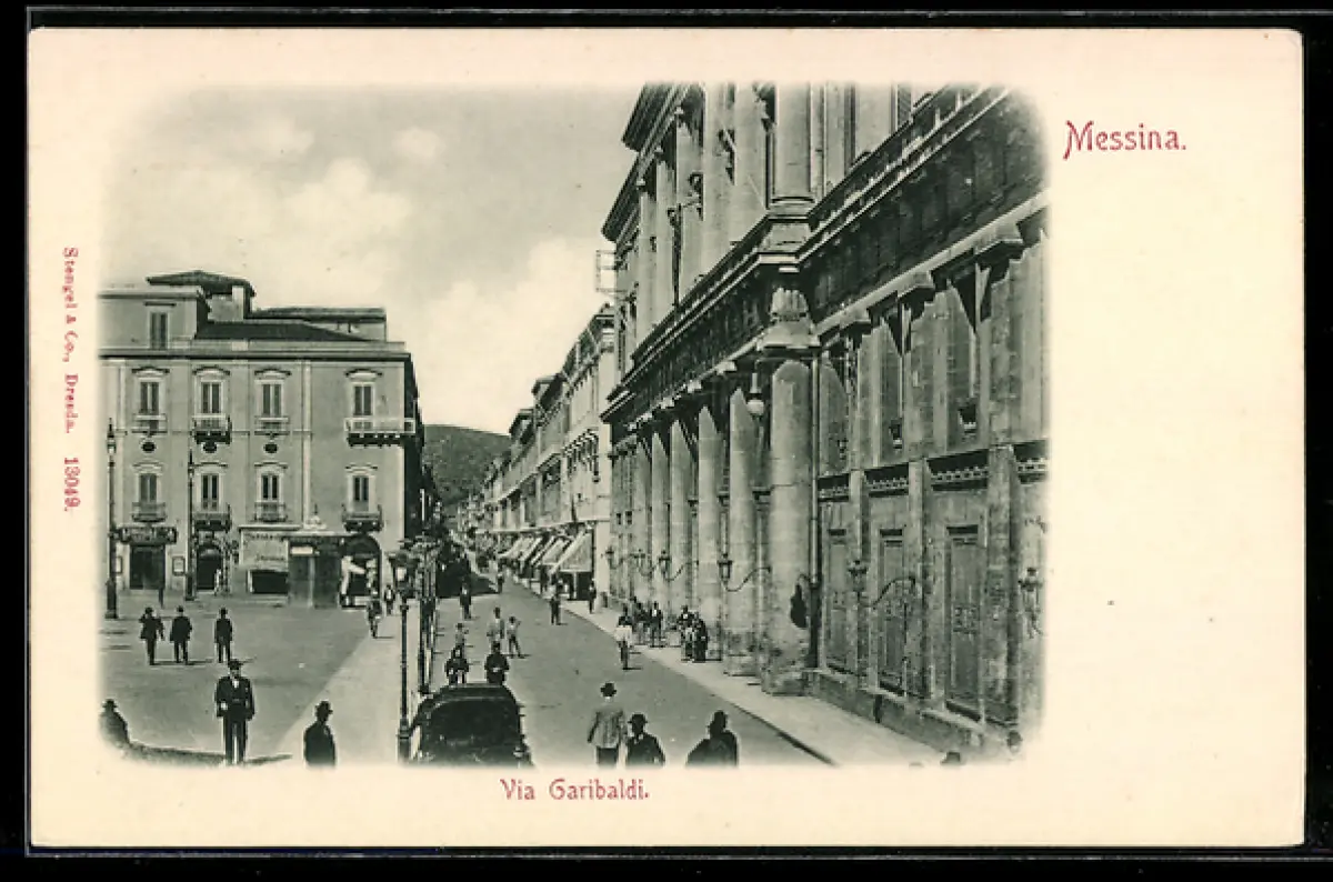 AK Messina, Via Garibaldi con passanti e edifici storici