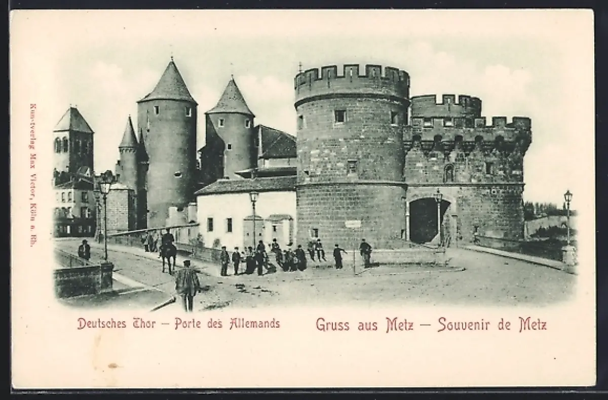 AK Metz, Porte des Allemands avec groupes de personnes sur le pont