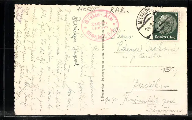Personenbezogene Daten auf der Rückseite der Karte wurden durch blauen Textmarker unkenntlich gemacht. Die blauen Stellen sind auf die Vorderseite durchgeweicht und wirken sich negativ auf das Postkartenfoto aus
