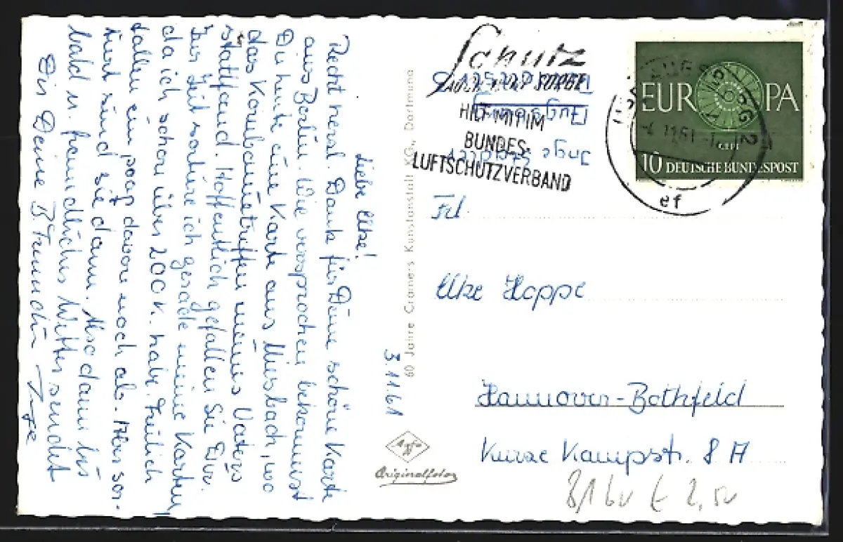 Personenbezogene Daten auf der Rückseite der Karte wurden durch blauen Textmarker unkenntlich gemacht. Die blauen Stellen sind auf die Vorderseite durchgeweicht und wirken sich negativ auf das Postkartenfoto aus