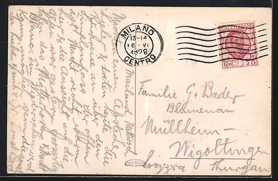 Personenbezogene Daten auf der Rückseite der Karte wurden durch blauen Textmarker unkenntlich gemacht. Die blauen Stellen sind auf die Vorderseite durchgeweicht und wirken sich negativ auf das Postkartenfoto aus