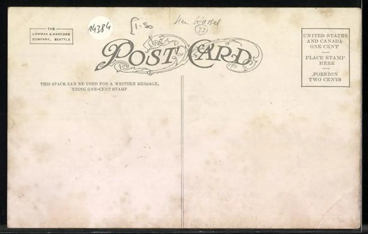 Personenbezogene Daten auf der Rückseite der Karte wurden durch blauen Textmarker unkenntlich gemacht. Die blauen Stellen sind auf die Vorderseite durchgeweicht und wirken sich negativ auf das Postkartenfoto aus