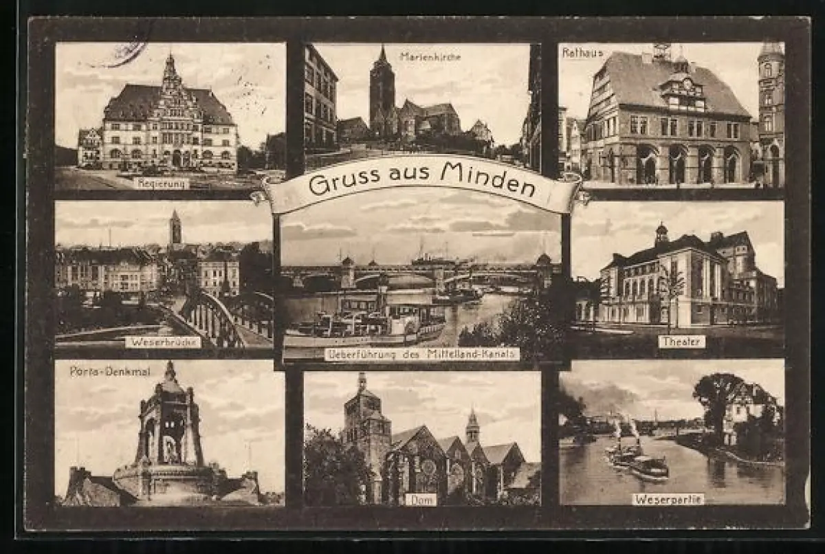 AK Minden / Weser, Regierung, Marienkirche, Rathaus, Weserbrücke, Dom, Theater, Weserpartie