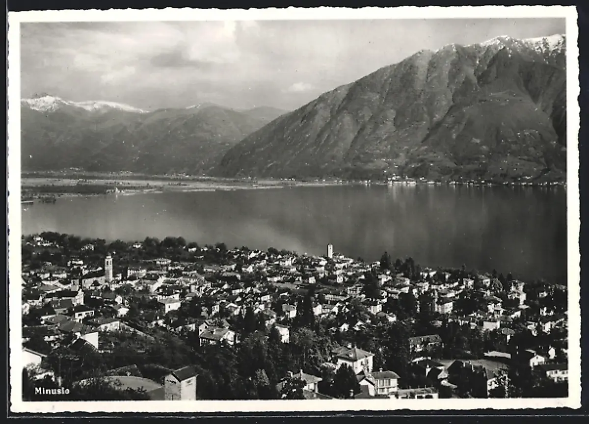 AK Minusio, Teilansicht mit Seeblick aus der Vogelschau