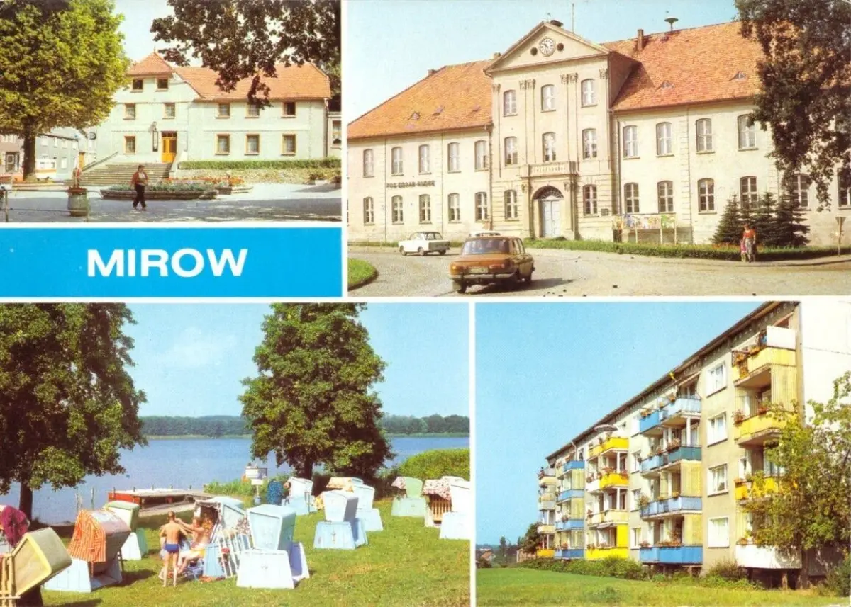 Ansichtskarte Mirow Kr. Neustrelitz vier Abb. - Markt, Etgar-André-Schule, Am Mirower See, Neubauten Erhaltung I-II postalisch gelaufen, gestempelt: unleserlich, um 1990 Herstellungsland: DDR Verlag: Bild und Heimat, Reichenbach i. V. - 01 03 0185/06