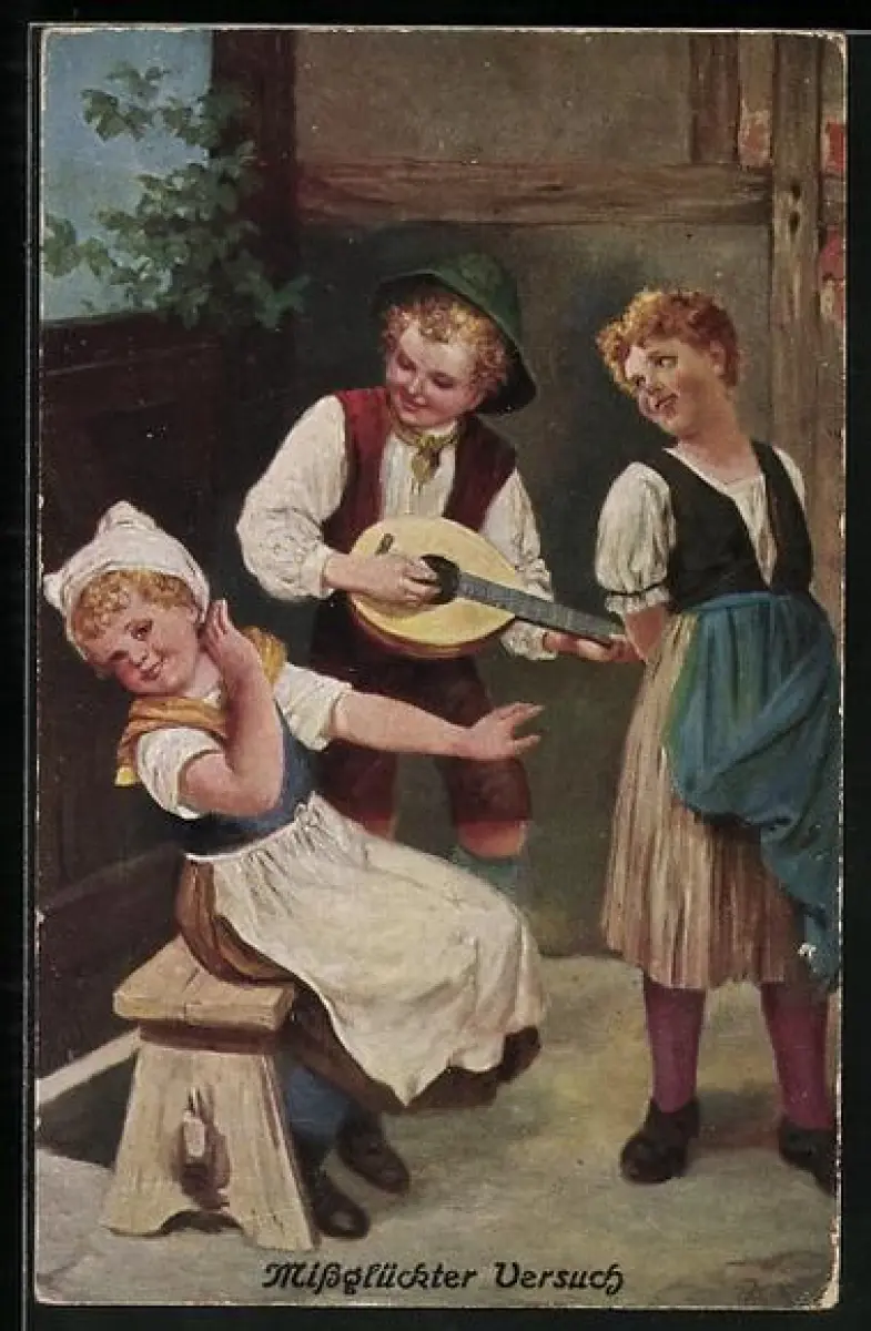AK Missglückter Versuch, Musikant mit Mandoline beim Ständchen