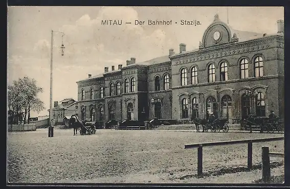 AK Mitau, Bahnhof mit Vorplatz und Fuhrwerken