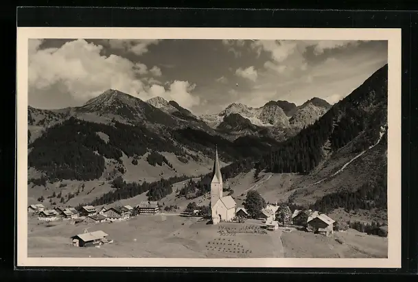 AK Mittelberg, Ortsansicht mit Kirche gegen Hammerspitze und Schafalpköpfe