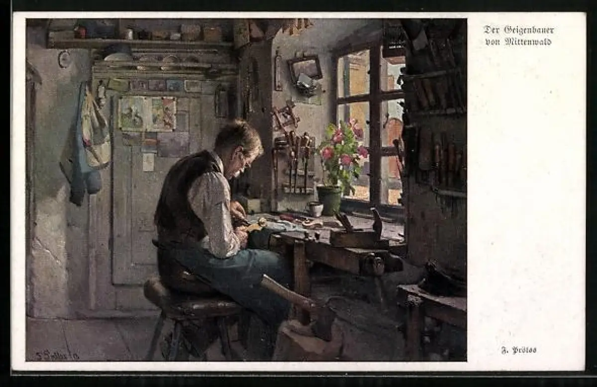 AK Mittenwald, Geigenbauer bei der Arbeit in seiner Werkstatt, Handwerk