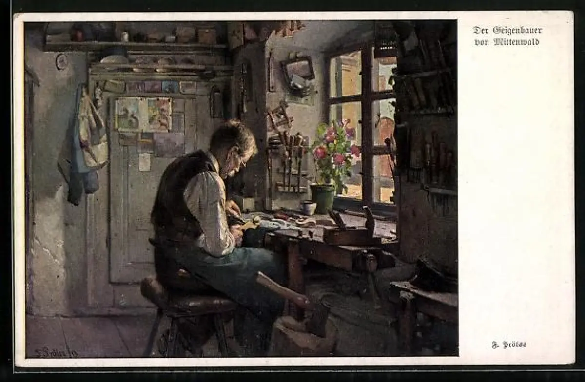 AK Mittenwald, Geigenbauer bei der Arbeit in seiner Werkstatt, Handwerk
