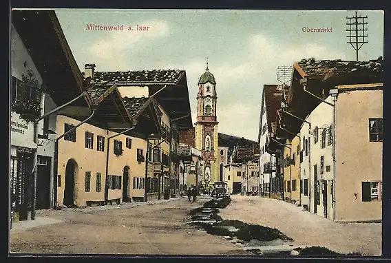 AK Mittenwald, Obermarkt-Strasse mit Blick zur Pfarrkirche