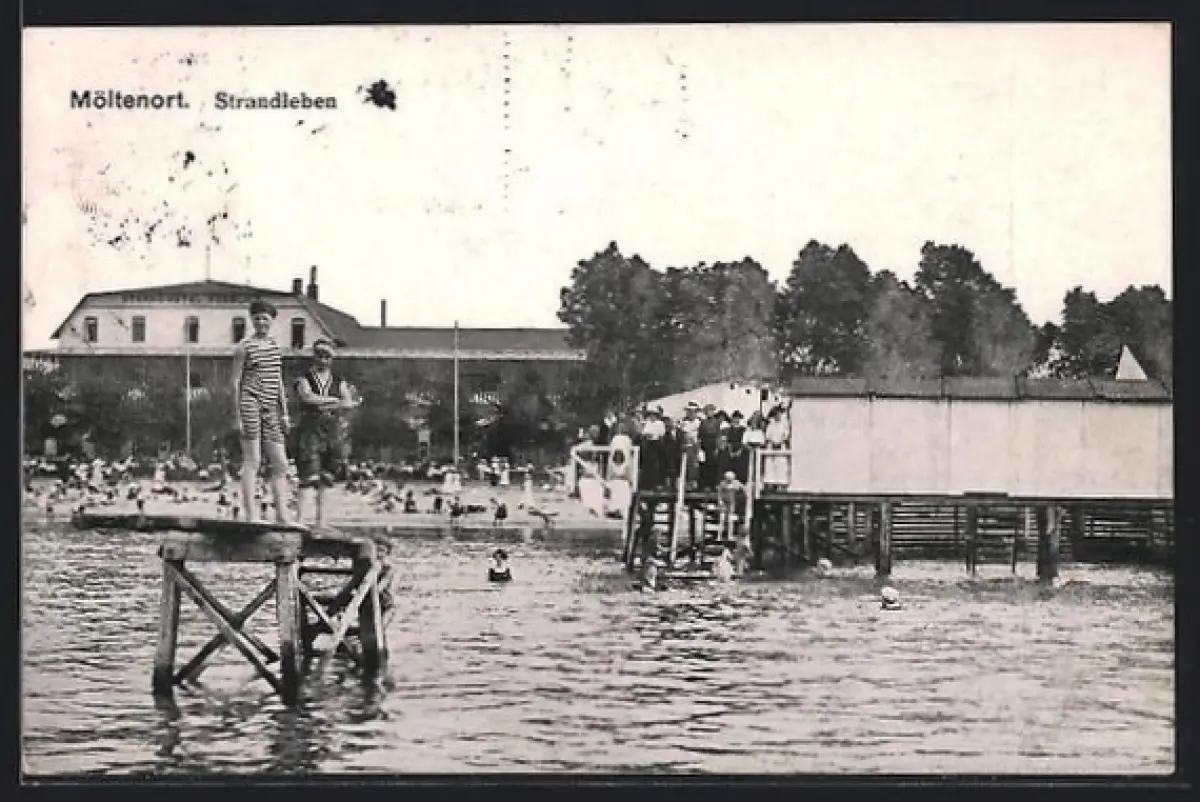 AK Möltenort, Strandleben und junge Männer in Badeanzügen