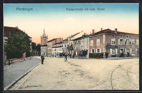AK Mörchingen, Klapperstrasse mit Kath. Kirche