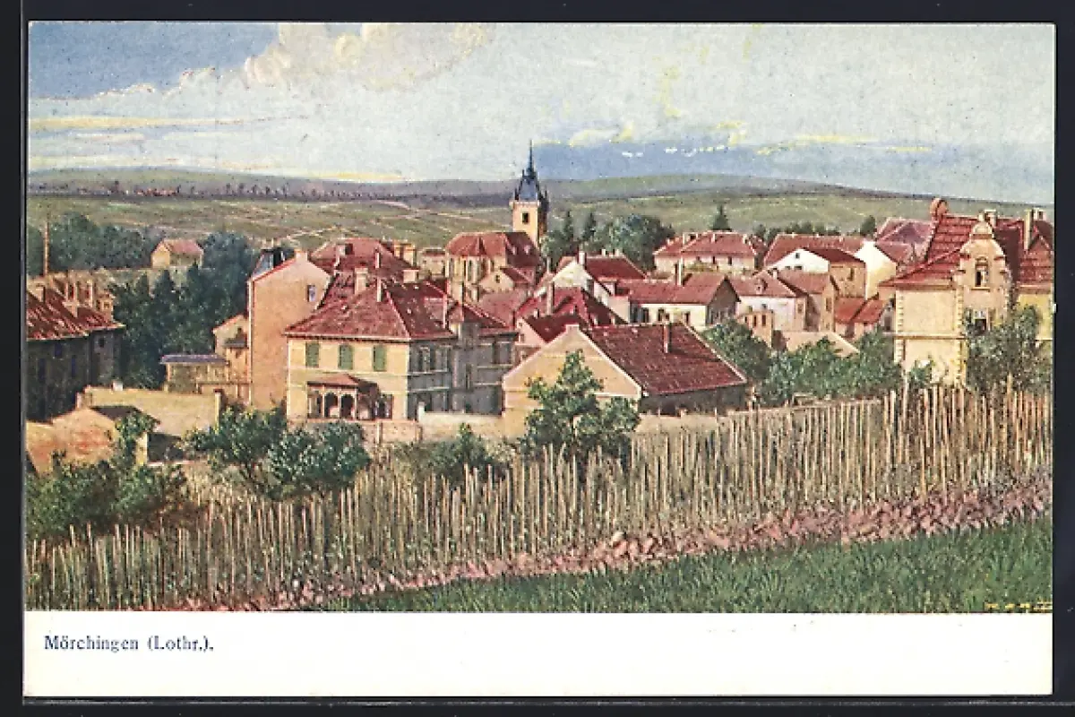 AK Mörchingen /Lothr., Vue sur le village avec église et vignobles environnants