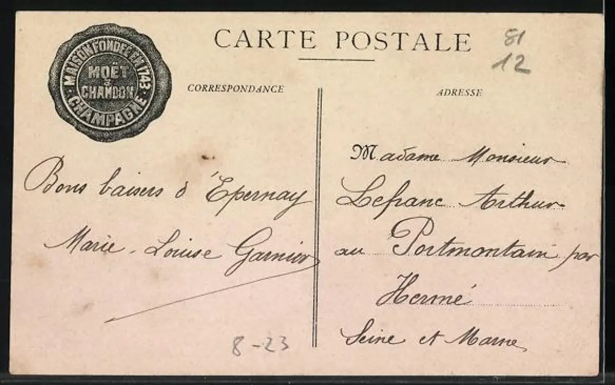 Personenbezogene Daten auf der Rückseite der Karte wurden durch blauen Textmarker unkenntlich gemacht. Die blauen Stellen sind auf die Vorderseite durchgeweicht und wirken sich negativ auf das Postkartenfoto aus