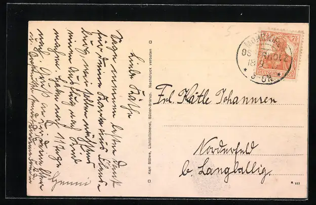 Personenbezogene Daten auf der Rückseite der Karte wurden durch blauen Textmarker unkenntlich gemacht. Die blauen Stellen sind auf die Vorderseite durchgeweicht und wirken sich negativ auf das Postkartenfoto aus
