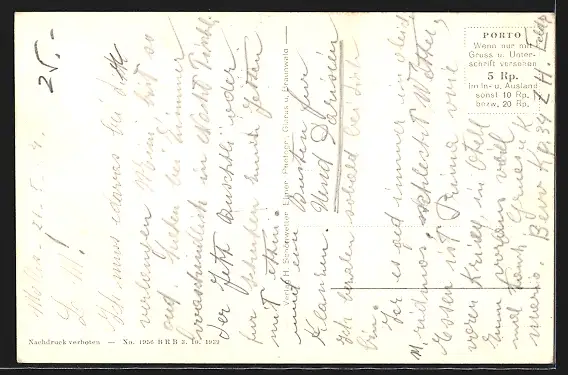 Personenbezogene Daten auf der Rückseite der Karte wurden durch blauen Textmarker unkenntlich gemacht. Die blauen Stellen sind auf die Vorderseite durchgeweicht und wirken sich negativ auf das Postkartenfoto aus