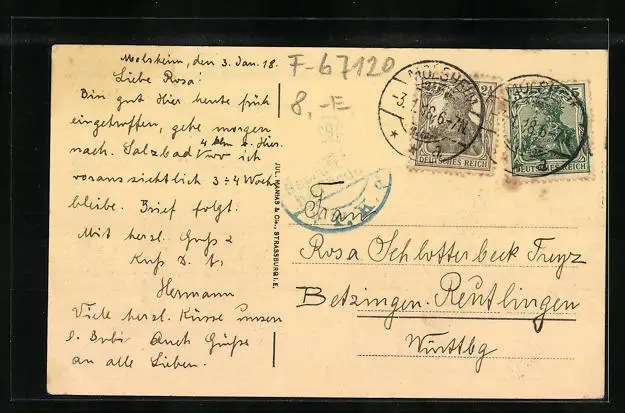 gelaufen 1918, Eckknicke re. unten, Stempelspur, guter Zustand