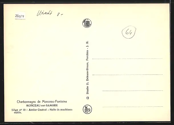 AK Monceau-sur-Sambre, Charbonnages de Monceau-Fontaine, siège no. 10, Atelier Central, halle des machines-outils