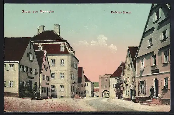 AK Monheim / Bayern, Unterer Markt mit Geschäft und Restaurant