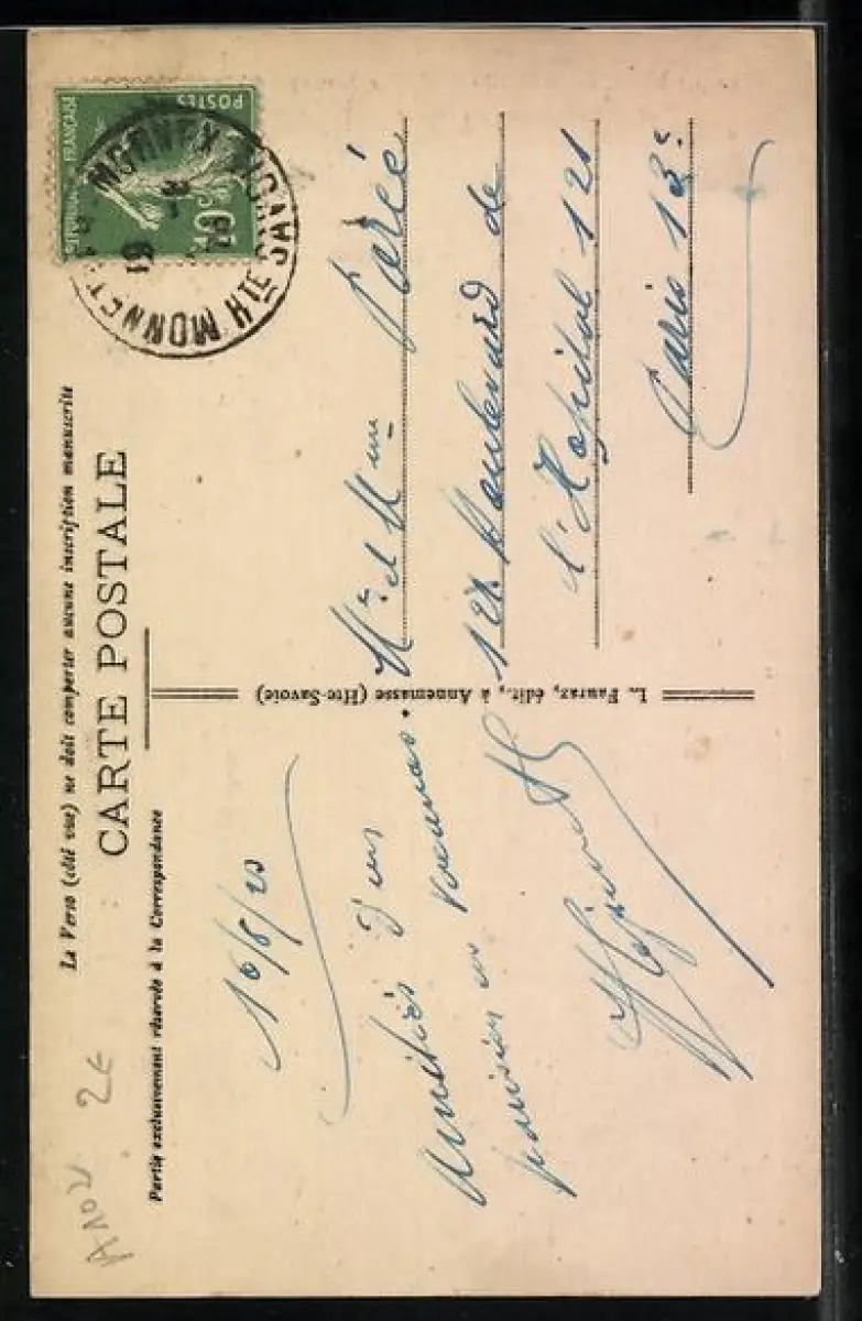 Personenbezogene Daten auf der Rückseite der Karte wurden durch blauen Textmarker unkenntlich gemacht. Die blauen Stellen sind auf die Vorderseite durchgeweicht und wirken sich negativ auf das Postkartenfoto aus