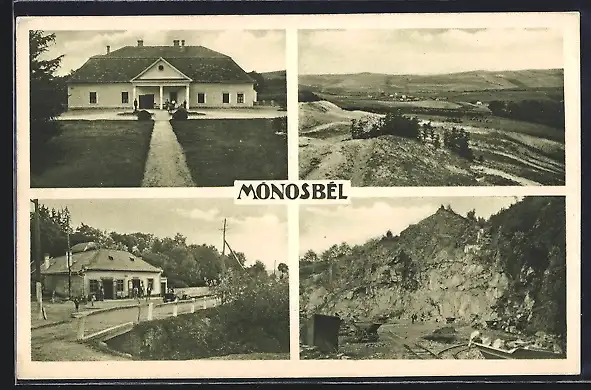 AK Monosbel, Vorderansicht eines Gebäudes, Strassenpartie, Gesamtansicht, Am Bergwerk