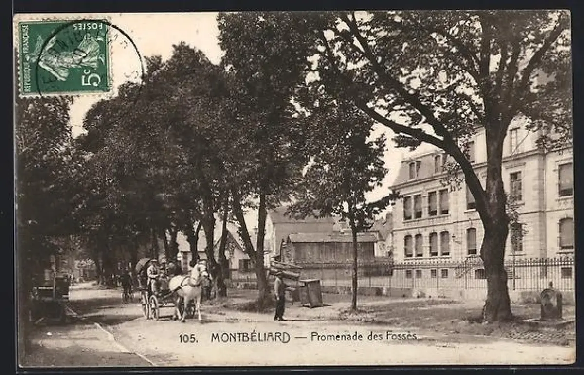AK Montbéliard, Promenade des Fossés avec charrette et arbres ombragés