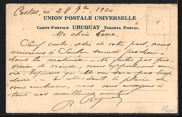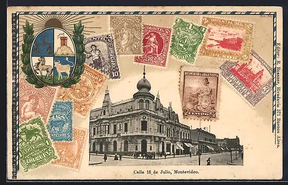 AK Montevideo, Calle 18 de Julio, Briefmarken mit Wappen