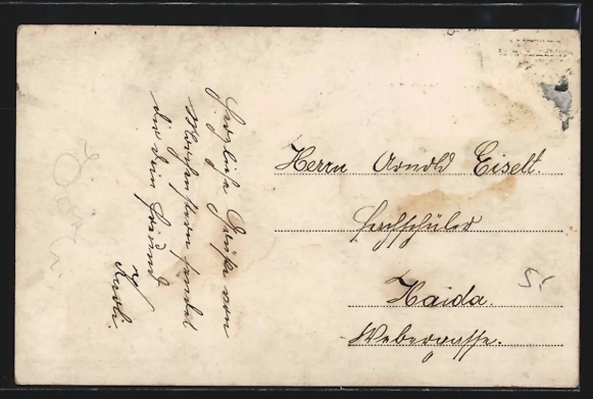 Personenbezogene Daten auf der Rückseite der Karte wurden durch blauen Textmarker unkenntlich gemacht. Die blauen Stellen sind auf die Vorderseite durchgeweicht und wirken sich negativ auf das Postkartenfoto aus