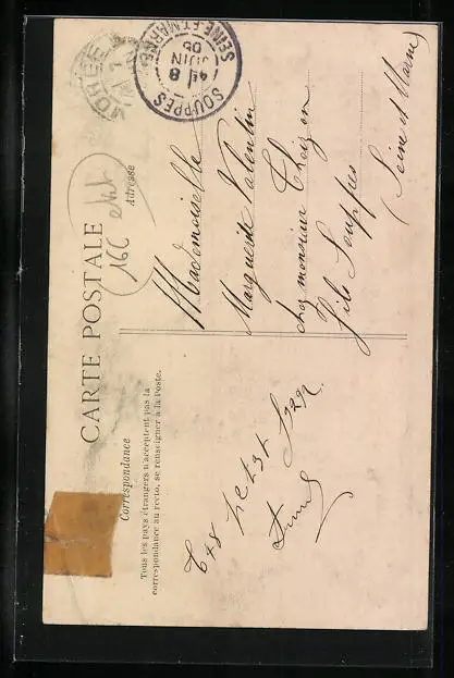 Personenbezogene Daten auf der Rückseite der Karte wurden durch blauen Textmarker unkenntlich gemacht. Die blauen Stellen sind auf die Vorderseite durchgeweicht und wirken sich negativ auf das Postkartenfoto aus