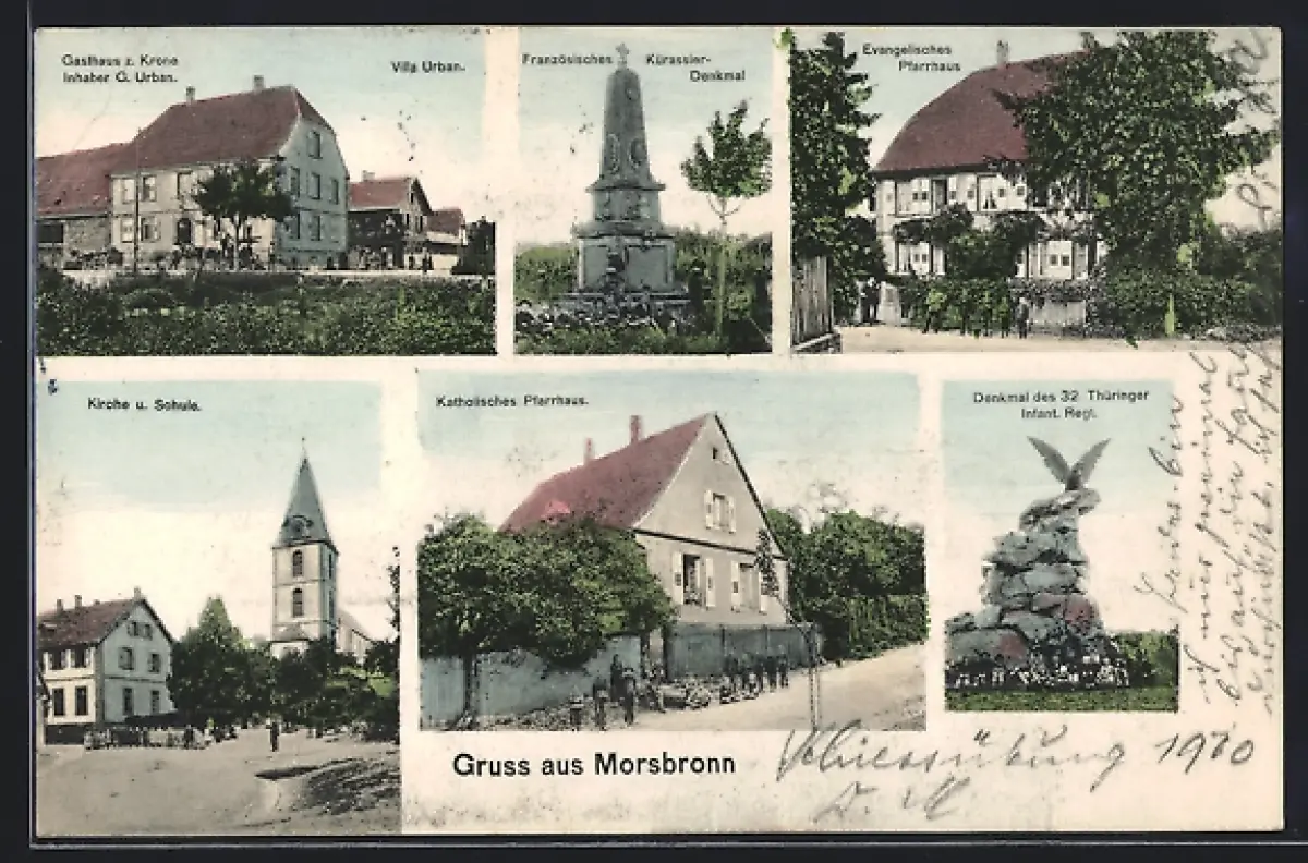 AK Morsbronn, Gasthaus z. Krone, Inh. G. Urban, Denkmal des 32. Thüringer Infant. Regt., Französisches Kürassier-Denkmal