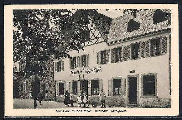 AK Moselkern, Gasthaus Moselgruss F. Sturm, Frontansicht mit Wirtsfamilie u. Nachbargebäude