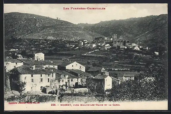 AK Mosset, vue sur le village et les Pyrénées-Orientales en arrière-plan