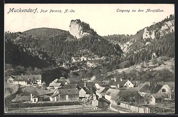 AK Muckendorf, Ortsansicht mit dem Eingang zu den Mirafällen