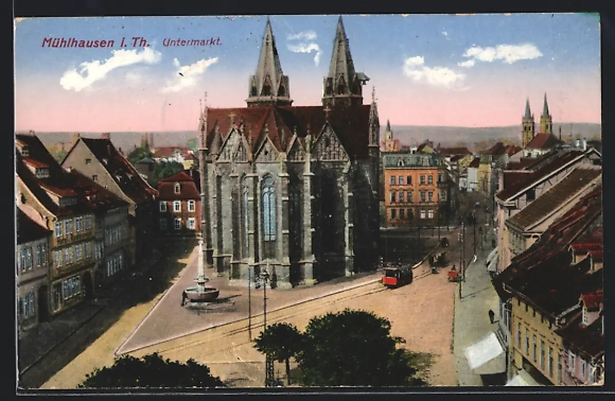 AK Mühlhausen i. Th., Untermarkt mit Strassenbahn