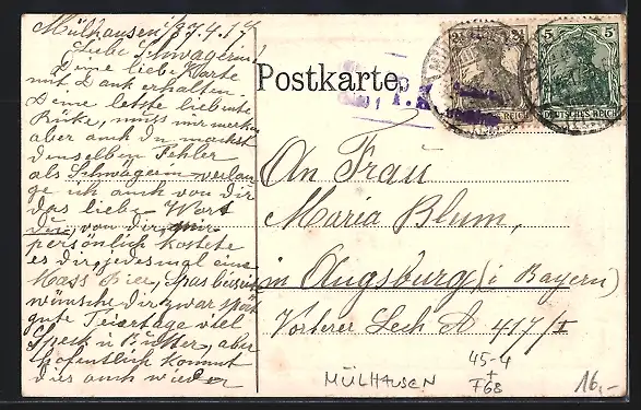 Personenbezogene Daten auf der Rückseite der Karte wurden durch blauen Textmarker unkenntlich gemacht. Die blauen Stellen sind auf die Vorderseite durchgeweicht und wirken sich negativ auf das Postkartenfoto aus