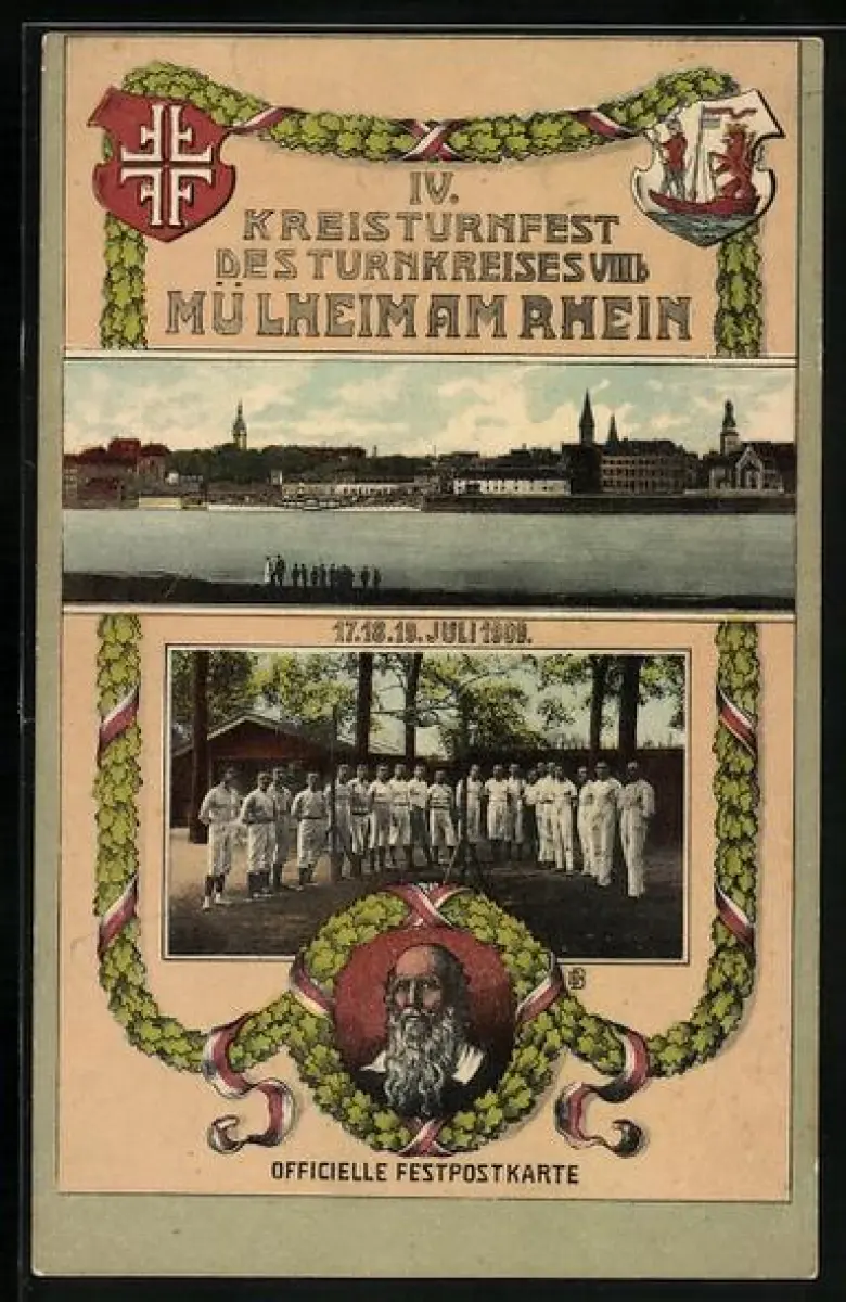 AK Mülheim am Rhein, IV. Kreisturnfest des Turnkreises VIIIb, 1909, Ortsansicht, Portrait Turnvater Jahn