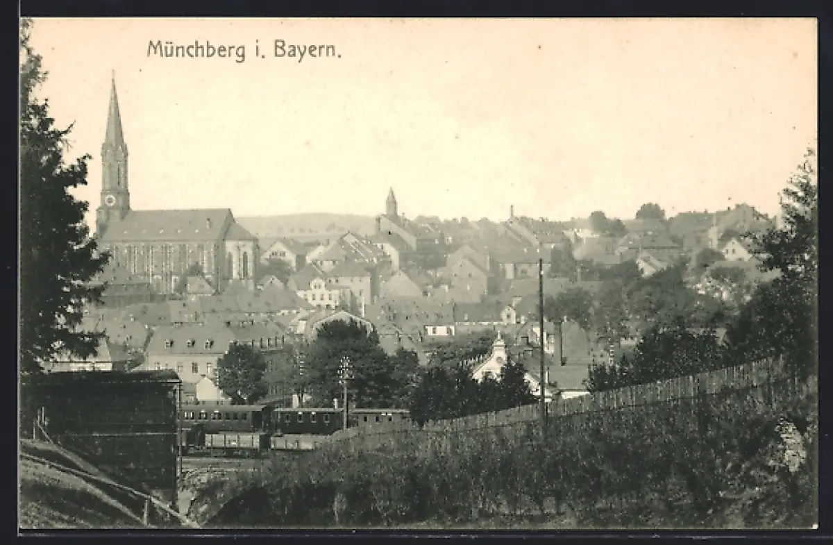 AK Münchberg i. Bayern, Stadtansicht mit Kirche und Eisenbahn