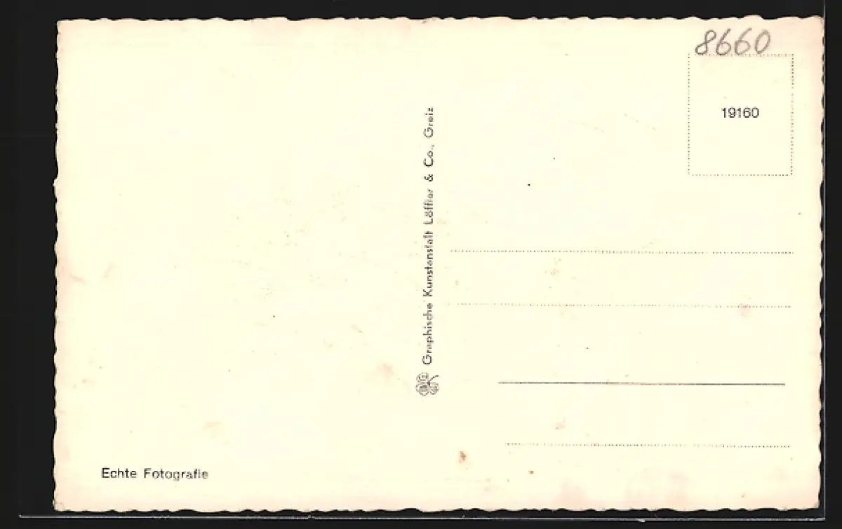 Personenbezogene Daten auf der Rückseite der Karte wurden durch blauen Textmarker unkenntlich gemacht. Die blauen Stellen sind auf die Vorderseite durchgeweicht und wirken sich negativ auf das Postkartenfoto aus