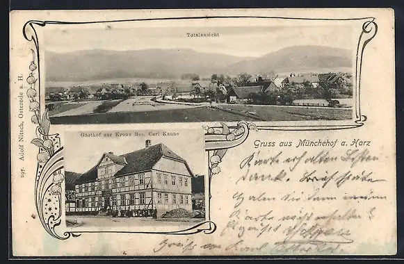 AK Münchehof a. Harz, Totalansicht und Gasthof zur Krone v. Carl Kaune