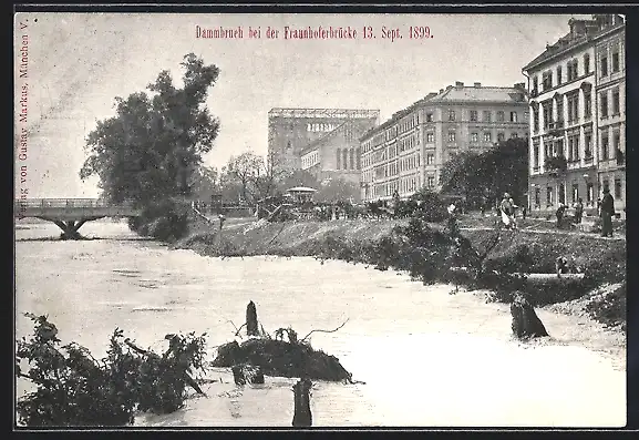 AK München, Dammbruch bei der Fraunhoferbrücke 1899, Unwetter