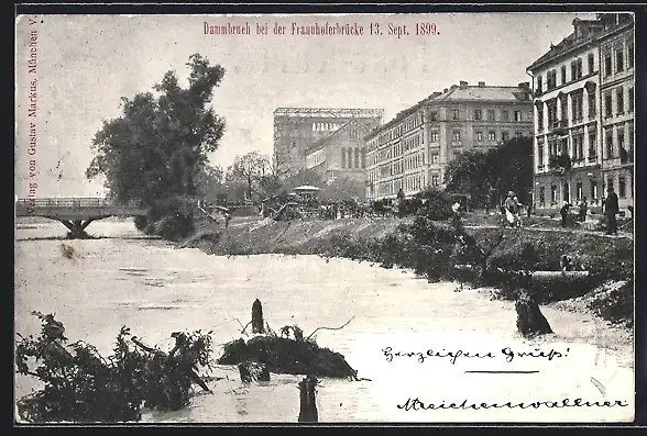 AK München, Dammbruch bei der Fraunhoferbrücke 1899, Unwetter