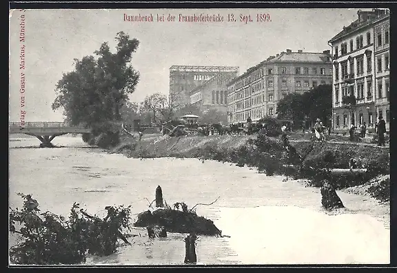 AK München, Dammbruch bei der Fraunhoferbrücke 1899, Unwetter