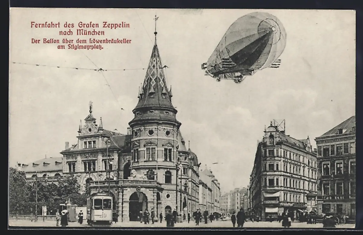 AK München, Fernfahrt des Grafen Zeppelin, der Ballon über dem Löwenbräukeller am Stiglmayrplatz