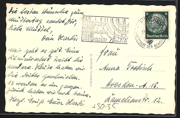 Personenbezogene Daten auf der Rückseite der Karte wurden durch blauen Textmarker unkenntlich gemacht. Die blauen Stellen sind auf die Vorderseite durchgeweicht und wirken sich negativ auf das Postkartenfoto aus