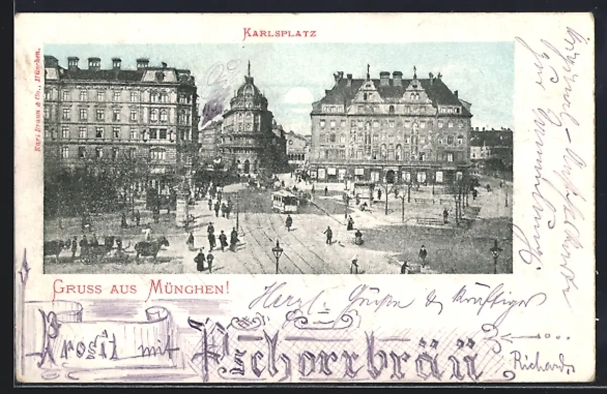 AK München, Karlsplatz mit Strassenbahn aus der Vogelschau