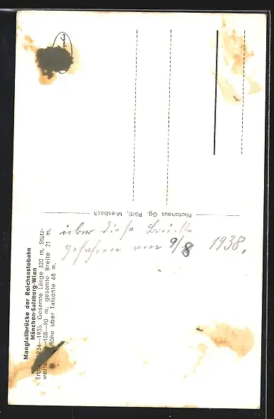 Personenbezogene Daten auf der Rückseite der Karte wurden durch blauen Textmarker unkenntlich gemacht. Die blauen Stellen sind auf die Vorderseite durchgeweicht und wirken sich negativ auf das Postkartenfoto aus