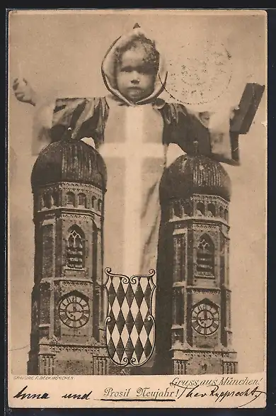 AK München, Münchner Kindl auf der Frauenkirche, Neujahrsgruss