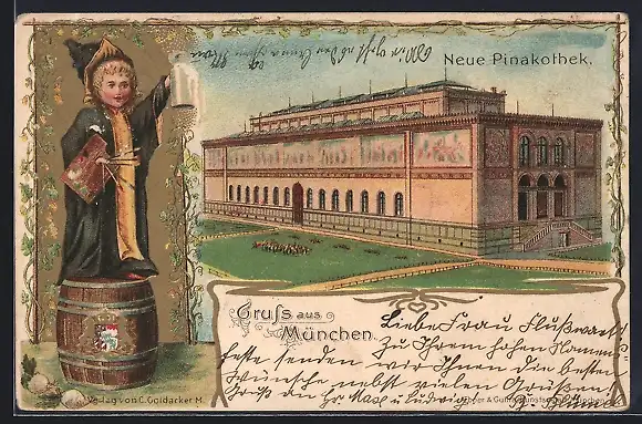 AK München, Münchner Kindl hebt sein Bierkrug, Neue Pinakothek