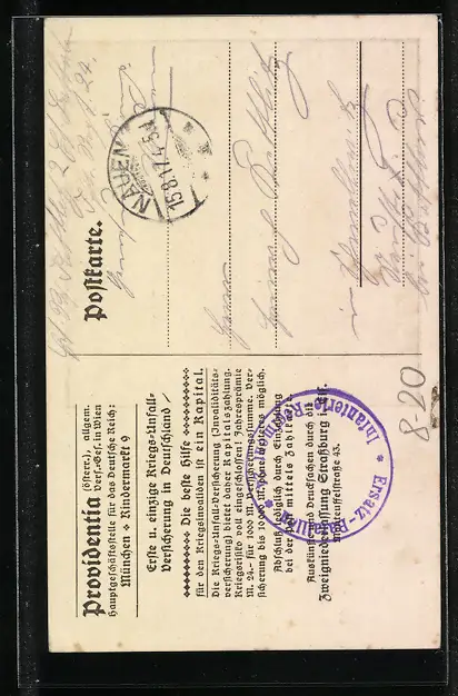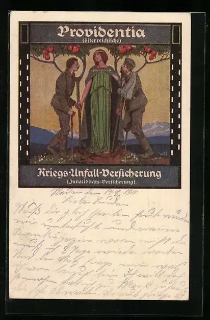 AK München, Providentia, Kindermarkt 9, Kriegs-Unfall-Versicherung, Kriegsinvaliden u. Frau unterm Apfelbaum